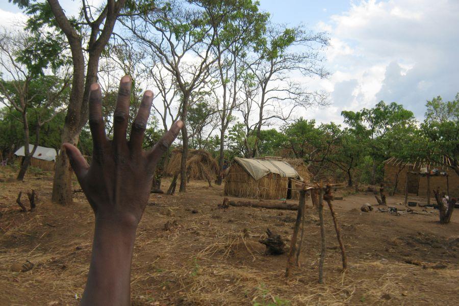 Provisorische Unterkunft von Vertriebenen an der Straße Bouar - Bocaranga. Tausende Menschen haben ihre Gehöfte verlassen, Ernten wurden von Milizen häufig vernichtet. Viele Vertriebene im umkämpften Westen des Landes sind bei Verandten untergekommen.Volker Gerdesmeier